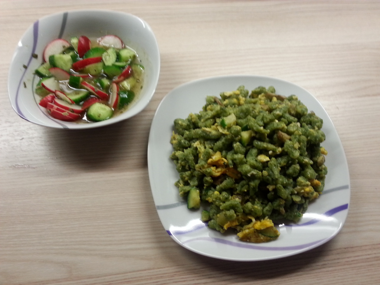 Eier-Spinatnockerl mit Gurken- und Radieschensalat